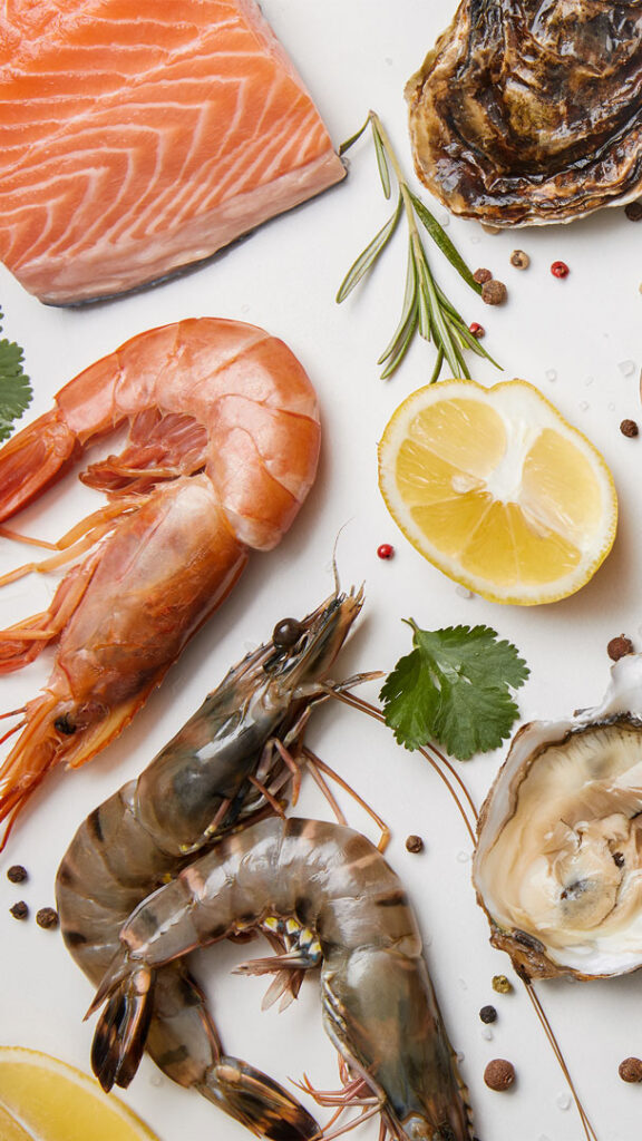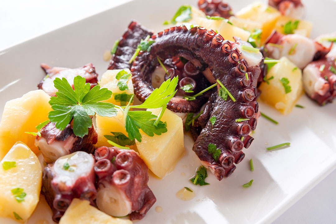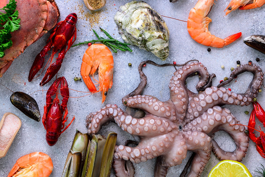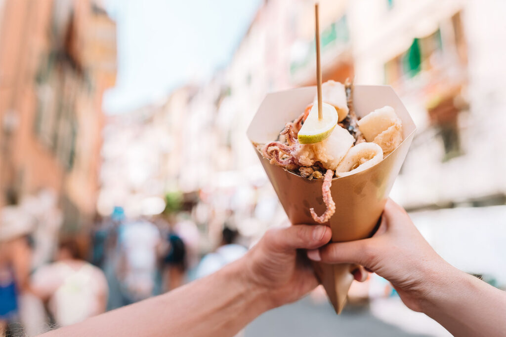 Cartocci di calamari, totani, gamberi, paranza, e piatti pronti selezionati (es. insalate di mare, polpo e patate).